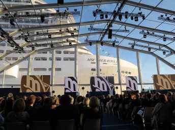 Prejav predniesli postupne Pierfrancesco Vago (výkonný prezident MSC Cruises), Laurent Castaing (generálny riaditeľ lodeníc STX France), Luc Lemonnier (nový starosta mesta Le Havre).
