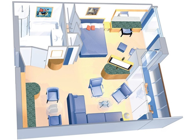 | VP - Ocean View Panoramic Suite (bez balkónu) 37 m². Panoramatické neotvárateľné okná. Oddelená časť s poschodovou posteľou. Extra WC. 12. paluba. Max 6 osôb. Výhody Suite. | 2 998 € 1 499 € za osobu | ||