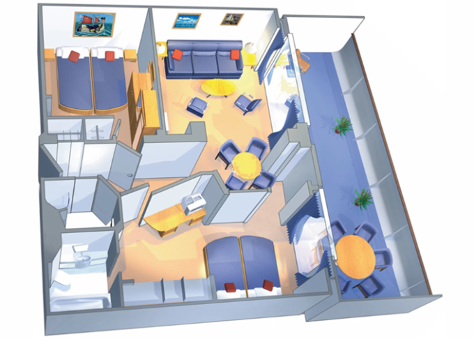| J3 - Junior Suite s balkónom 26 m² + balkón 4,5 m² / niektoré kajuty majú obmedzený výhľad. Max 3-4 osoby. | 3 228 € 1 076 € za osobu | ||