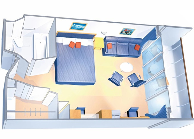 | VP - Ocean View Panoramic Suite (bez balkónu) 37 m². Panoramatické neotvárateľné okná. Oddelená časť s poschodovou posteľou. Extra WC. 12. paluba. Max 6 osôb. Výhody Suite. | 3 465 € 1 155 € za osobu | ||