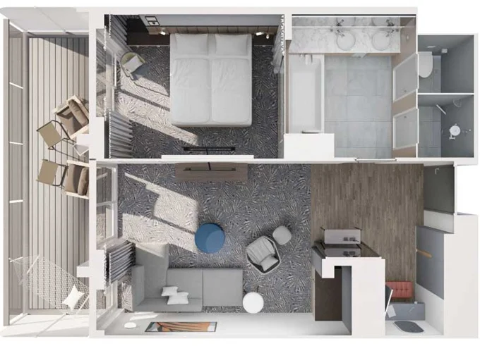 | JKBO - Junior Suite s balkónom B 26 m² + balkón 7 m² so stoličkami a podnožkami. 8-12. paluba. Max 4 osoby. Výhody Junior Suite. | 4 698 € 4 698 € za osobu |